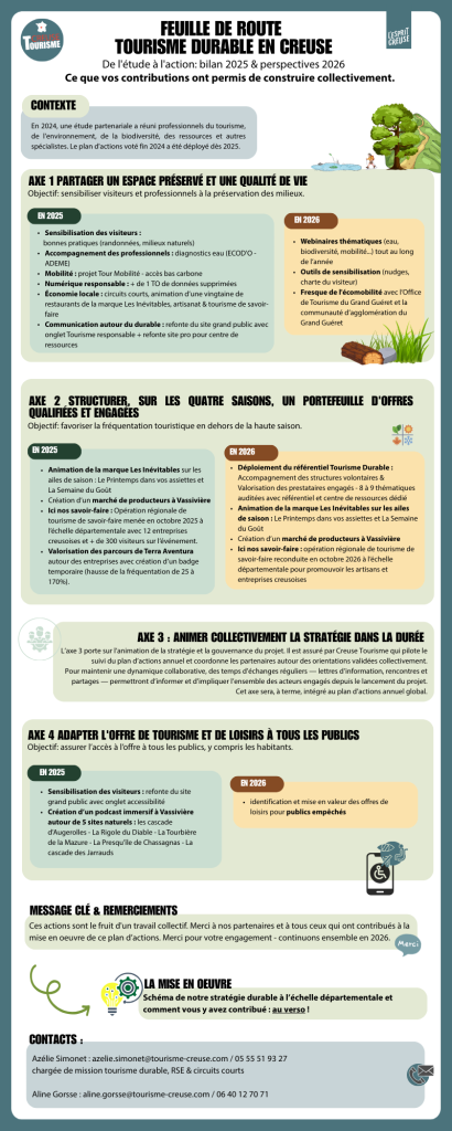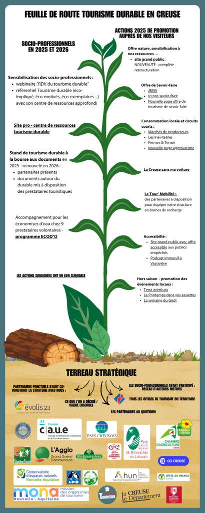 Le tourisme durable étant fléché comme un axe de développement majeur dans le département, Creuse Tourisme a travaillé en partenariat avec les Offices de Tourisme et les acteurs du durable pour élaborer un plan d’actions du tourisme durable jusqu’en 2028.